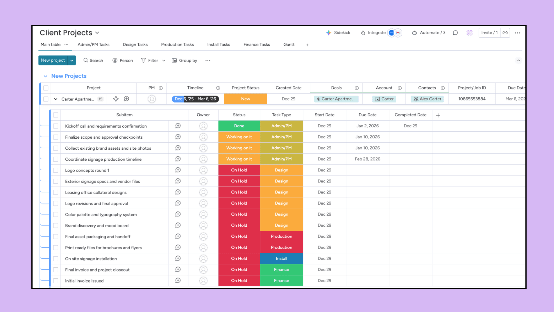 It centralizes all client work in one place so teams can see project status, next steps, and ownership at a glance. Design, production, and install teams know exactly what is ready, what is blocked, and what is coming next.